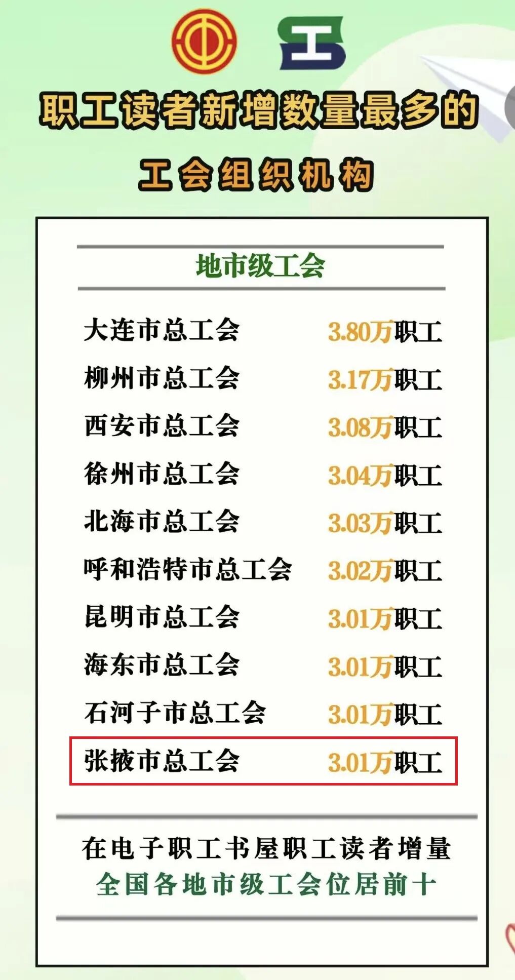 12月31日,《全国工会电子职工书屋阅读报告》发布,张掖市总工会入选“电子职工书屋职工读者新增数量最多的工会组织机构”,在全国地市级工会中跻身前十!