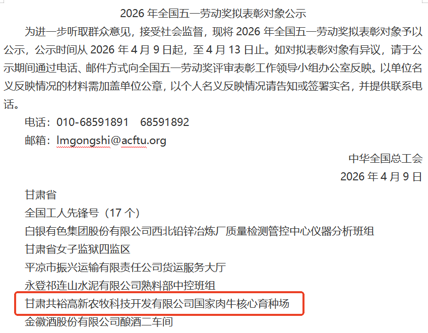 4月9日,中华全国总工会对2026年全国五一劳动奖拟表彰对象进行公示,张掖市高台县的甘肃共裕高新农牧科技开发有限公司国家肉牛核心育种场拟获评全国工人先锋号。