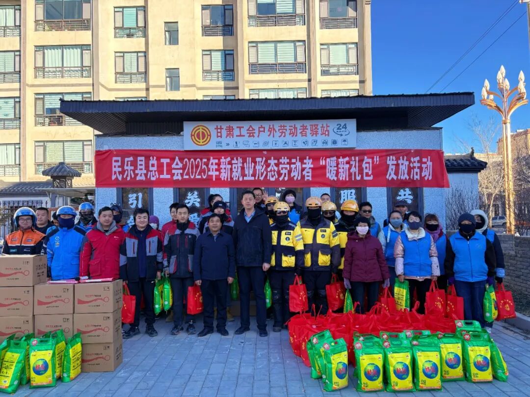 寒潮来袭,暖意先行。为切实把党和政府的关怀与工会组织“娘家人”的温情送到职工心坎上,12月3日,民乐县总工会在工会驿站·骑手之家古城站点隆重举行新就业形态劳动者“暖新礼包”发放活动。60份装满大米、洗衣液、毛巾等生活必需品的“暖新包裹”,精准递到快递员、外卖员、护工护理员等新业态劳动者手中,让奔波在外的他们在冬日里感受到实实在在的温暖与牵挂。
